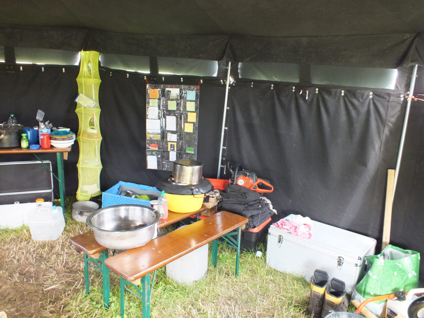Unser Küchenlager – mit dem wichtigsten Küchengerät bei einer Waldjugend-Veranstaltung – ohne Motorsäge geht gar nix